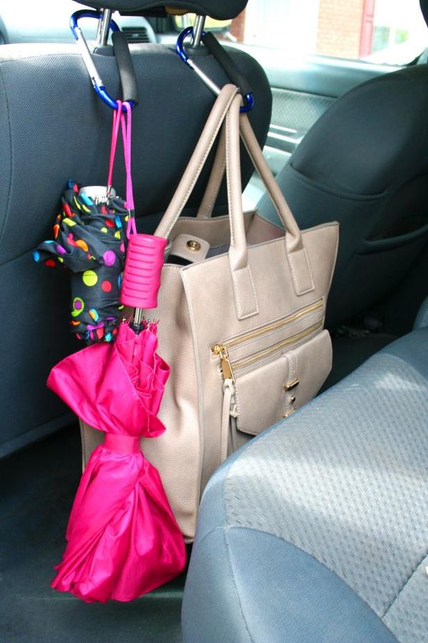 Tired of your purse and grocery bags tipping over in the back seat? No problem, grab a few of these carabiner clips and slap them onto your headrest handles! They’ll keep your purse, bags, and umbrellas safely secure with ample space in the back for passengers.