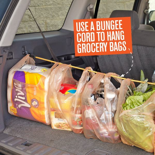 There’s no way I would have thought of doing this but I have to admit, it’s a pretty neat trick. If you’re like me and don’t have bungee cables hanging around, just purchase some rope or stretch cable and install it in your boot to keep grocery packets upright and secure.